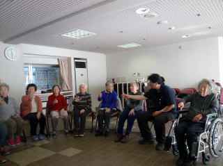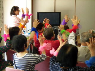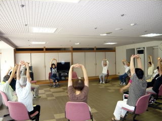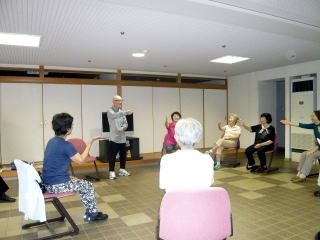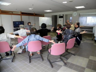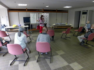 センティホールの大型テレビにて踊り指導を楽しみ、坐位での体操となりました。