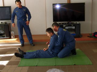 AED講習の後に行った体操は、股関節を伸ばすことを中心に行いました。