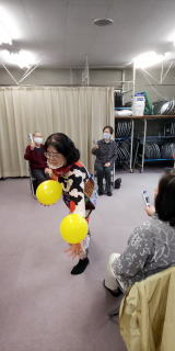 マスク着用で懐かしい日本のメロディーを口ずさみ、トーンチャイムとよぶ音色の美しい楽器で黄色の風船(お月様)を空高く〜の気持ちで飛ばして楽しみました。